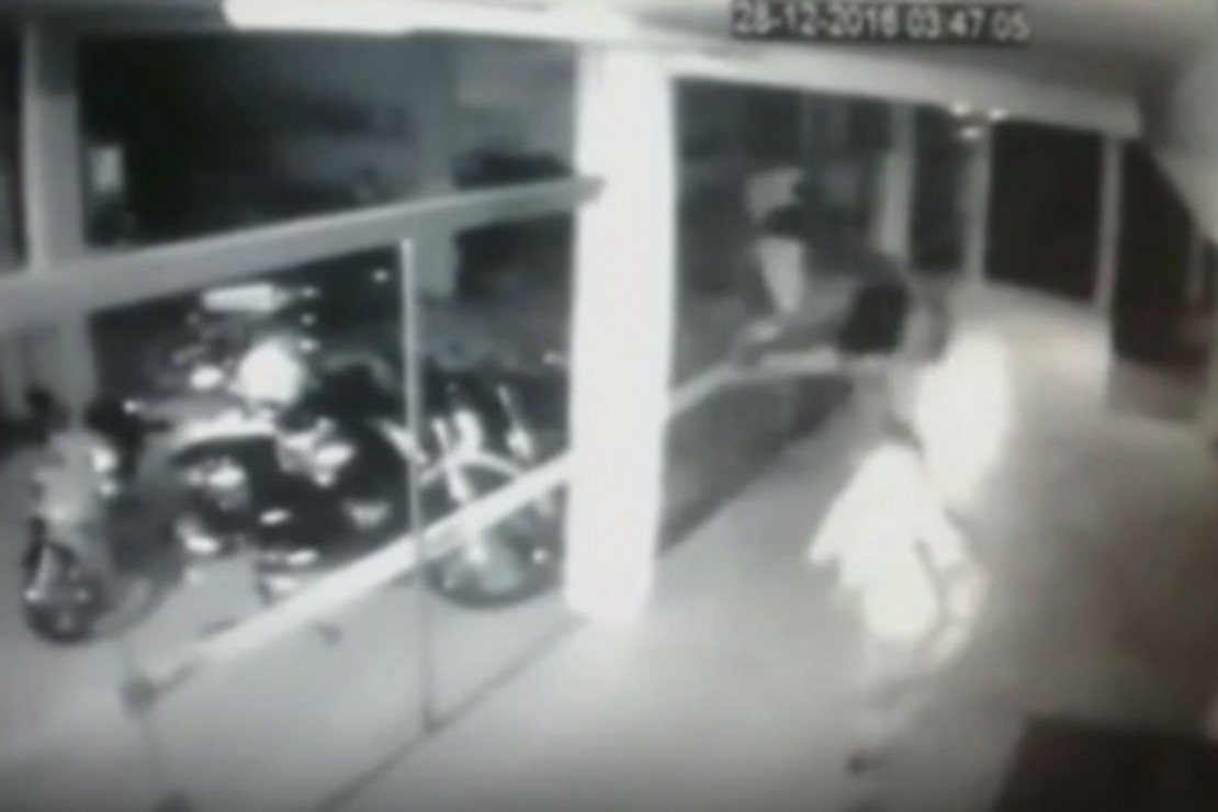 As imagens da tentativa do roubo foram registradas pelas câmeras de segurança do local. De acordo com a polícia, parte da porta cortou a perna do rapaz.