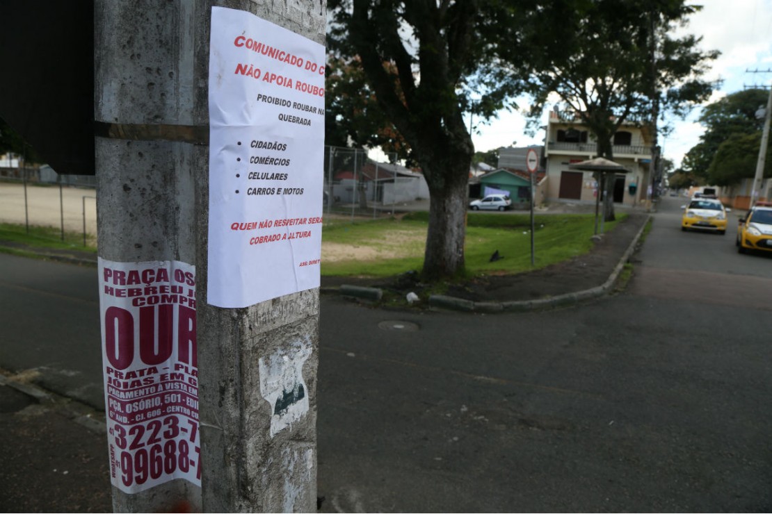 Quem passa pelo bairro Cidade Industrial de Curitiba (CIC), encontra alguns recados em postes da Vila Nossa Senhora da Luz. O aviso colado esta semana, escrito em vermelho e em folha sulfite, é uma ameaça aos assaltantes da região. O autor, que ainda não foi identificado, avisa que é “proibido roubar na quebrada e quem não respeita será cobrado à altura”. Os papéis foram colados recentemente em quase todos os postes da vila.