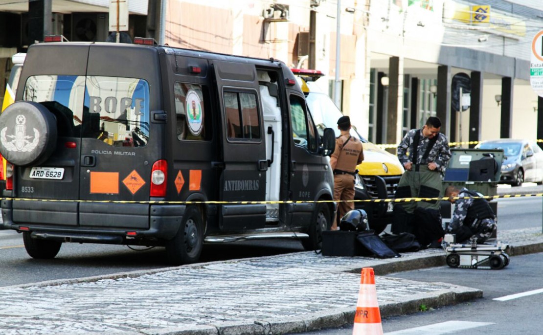 Uma caixa, com um saco plástico azul e um relógio dentro, deixada em frente ao Juizado da Mulher na Avenida João Gualberto, no bairro Alto da Glória, mobilizou o Esquadrão Antibombas do Comando de Operações Especiais da PM na manhã desta terça-feira (06).