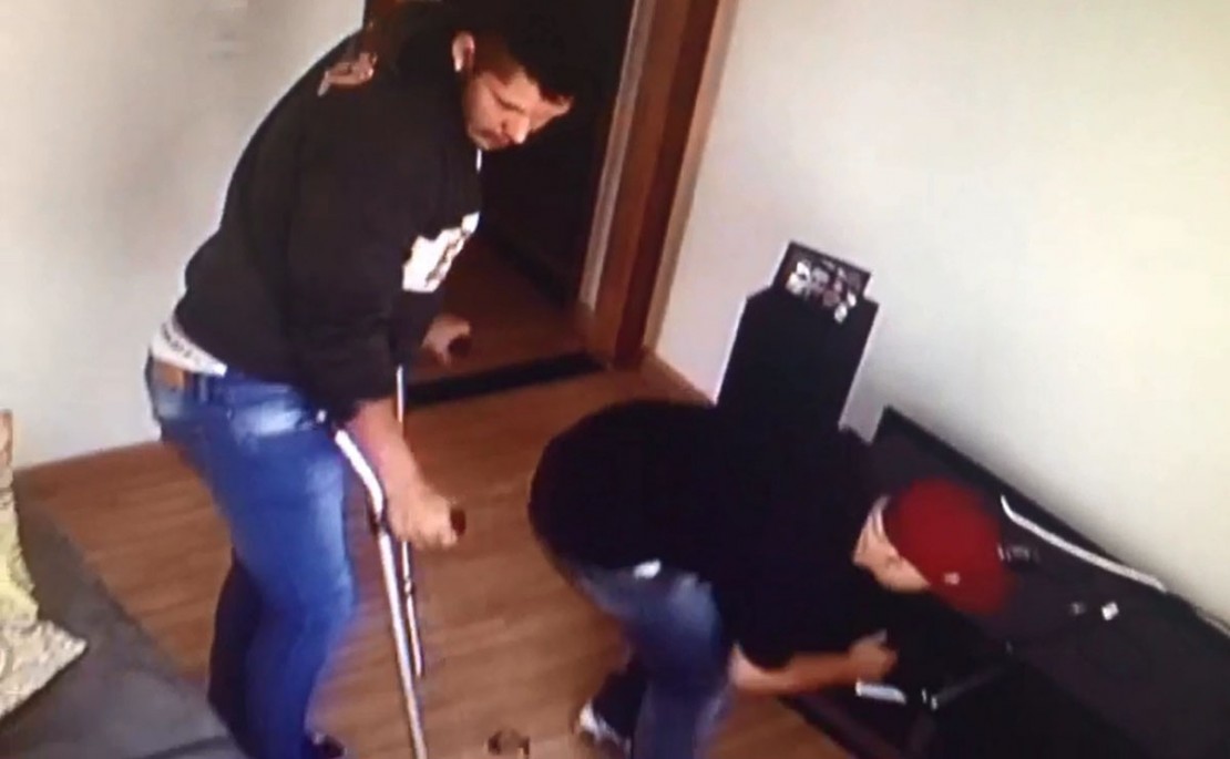 Para invadir a casa, eles arrombaram a porta principal. Dentro da residência, a dupla começa a fazer a limpa e chega mais um comparsa, que ajuda a pegar mais objetos do local. Em alguns momentos, o rapaz de muleta abandona os apoios, mas aparentemente não consegue se sustentar direito em pé.
