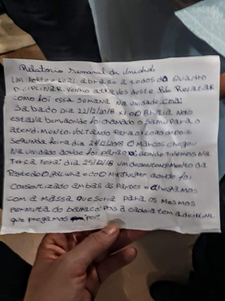 Além do “Dicionário”, os guardas e policiais também encontraram um relatório semanal, onde provavelmente a “sintonia” relata o comportamento dos presos daquela “unidade” do PCC, a unidade “cma”. Os relatórios são feitos por celas (os “X”) e os presos têm códigos ou apelidos. Lá eles informam o estado de saúde de presos que precisaram de ajuda médica, os presos que chegaram ou saíram daquela cadeia, os desentendimentos (o “galinha”, que brigou com o “mikjheguer”) e quais providências foram tomadas para os “brigões”.