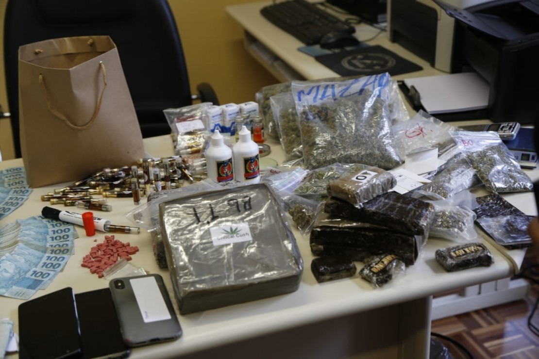 Os policiais da Denarc também estiveram na casa do motorista do HB 20. Lá, foram encontradas caixas com embalagens para haxixe e diversas drogas, entre elas 97 gramas de maconha, 500 gramas de haxixe, três ampolas de óleo de cannabis, um envelope com pasta de maconha e duas sementes da droga.