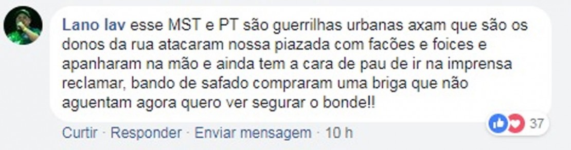 Nas redes sociais, Lano acabou se manifestando de uma forma que pareceu ameaçar os integrantes do MST, dizendo que “compraram uma briga que não aguentam” e que teriam que “segurar o bonde”, mas ele negou que tenha sido essa a intenção. “Foi só um comentário na hora da raiva. Afinal, eles fecham ruas, jogam barracas na frente da casa dos outros e ninguém pode falar nada. Se fosse qualquer outro movimento fazendo isso, levaria bala de borracha”, defendeu.