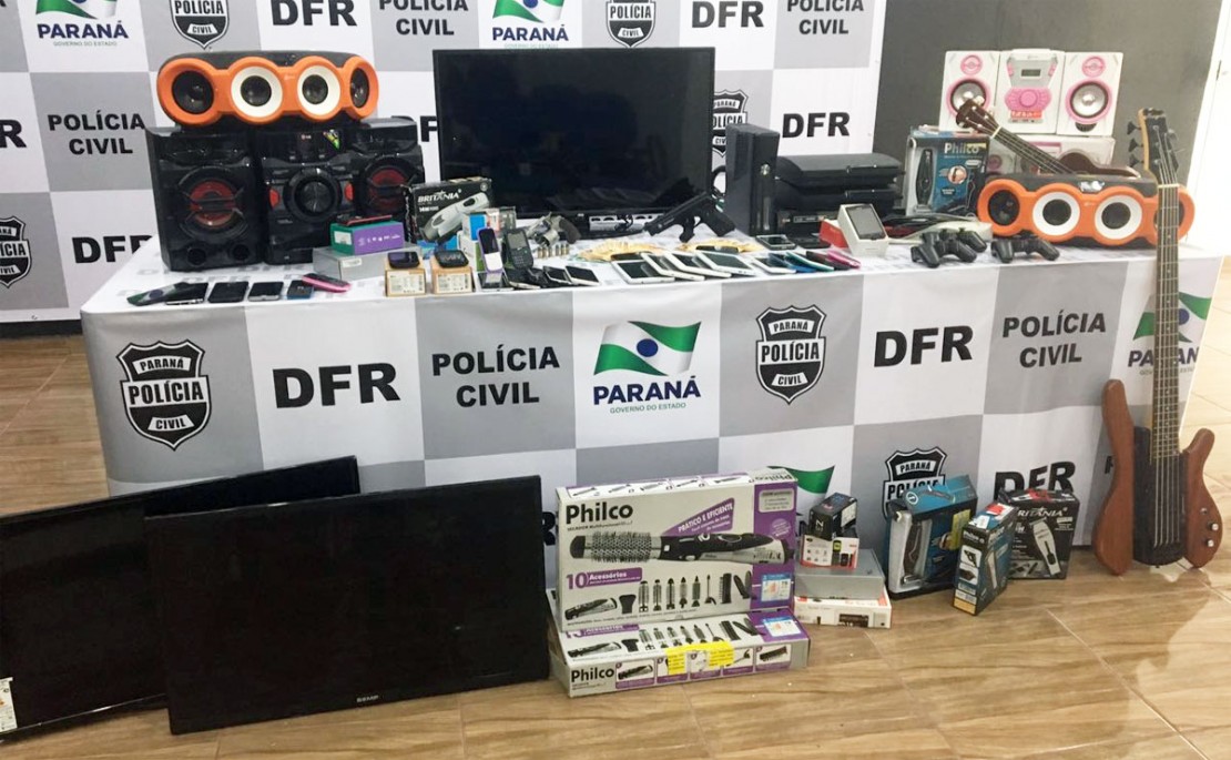 No endereço apontado, uma casa na Vila Amélia, em Pinhais, Região Metropolitana de Curitiba (RMC), os policiais encontraram o resto do que tinha sido furtado. A especializada apreendeu cinco TVs (32, 49 e 50 polegadas), três videogames, quatro tablets, cinco aparelhos de som, DVD, além de 28 celulares e dois instrumentos musicais entre outros eletrônicos.
