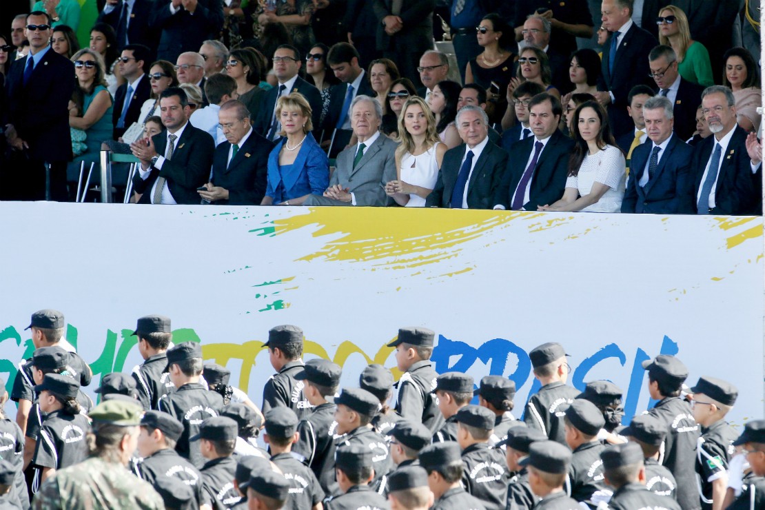 Em minoria, o grupo que protestou foi imediatamente hostilizado pelos demais. “A nossa bandeira nunca será vermelha”, gritou o grupo majoritário. Os ânimos só se acalmaram com o início do desfile, pouco depois das 9 horas. De acordo com a assessoria de imprensa da Presidência da República, o acesso para as arquibancadas próximas a Temer era restrito a convidados de funcionários do Palácio do Planalto. No meio do público, contudo, não era difícil encontrar gente sem ligação com o governo federal, mas que tinha recebido o convite de terceiros, ou seja, de pessoas que haviam desistido de participar da cerimônia.