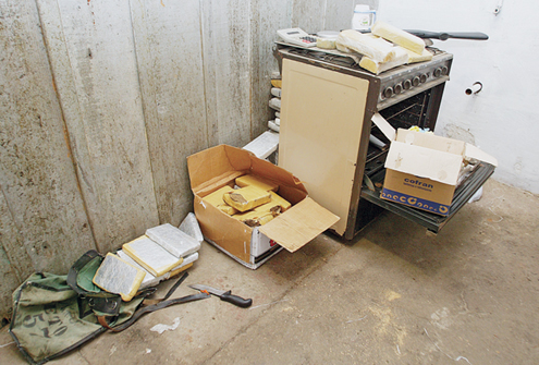 Vários tabletes estavam escondidos no forro do teto e das portas do cavalo do veículo. Parte da droga já havia sido retirada do caminhão e era empilhada em uma pequena sala da oficina.