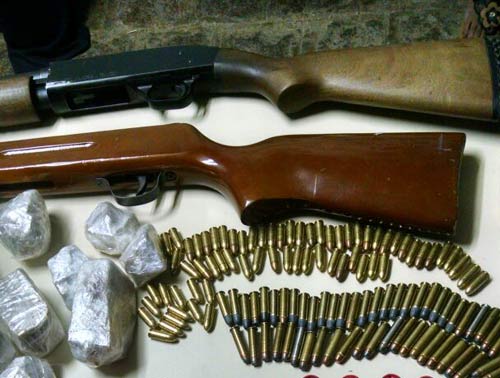 Dentro da casa foram encontradas uma escopeta, uma espingarda, uma pistola calibre 380 e duas pistolas  9 milímetros. Também havia um carregador de pistola 380 sem munição, uma munição de calibre 22, quatro munições de calibre 32, 20 munições de calibre 38, 53 munições de calibre 357, 23 munições de calibre 380,  33 munições de 45, 67 munições de 9mm, 34 munições de calibre 12 e 30 munições de calibre .40.