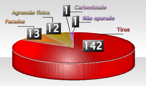 A arma de fogo foi usada em 84% dos assassinatos. Apesar da campanha de desarmamento, bandidos continuam portando revólveres e pistolas de diversos calibres. O homicídio ficou caracterizado em 90% dos casos.