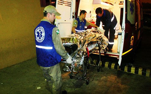 Rodrigo Rosa de Moraes, 31 anos, foi “metralhado” no pátio de uma casa noturna, na Rua Luiz França, Vila Oficinas, no Cajuru, no início da madrugada. Socorrido pelo Siate e levado ao pronto-socorro do Hospital Cajuru, constatou-se que ele tinha 22 perfurações, por todo o corpo. Até a noite de ontem, ele continuava internado na Unidade de Terapia Intensiva (UTI).