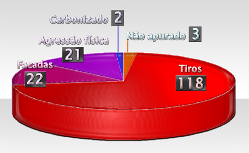 Dezembro foi o mês que menos registrou mortes causadas por arma de fogo, desde agosto. Foram 118 vítimas fatais de tiros, o que representa 71% do total. Houve aumento dos casos de agressão física e mortes por arma branca que, somados, representaram 26% dos crimes. Em seis assassinatos, as vítimas foram roubadas pelos criminosos, caracterizando latrocínio.