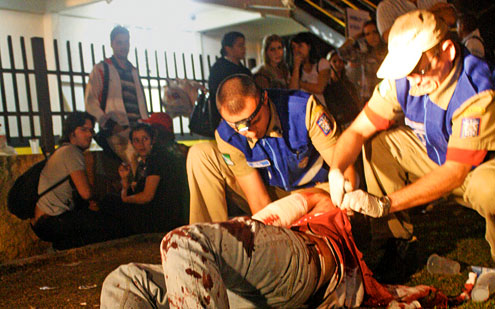 V. M.V., 19, foi golpeado na cabeça e permanece internado, em estado grave, no Hospital Evangélico. D.S.S., 23, foi atingido no peito e nas nádegas, também foi hospitalizado, mas já recebeu alta.