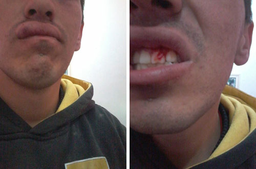 Depois da discussão, o tenente teria dado um soco no rapaz, que reagiu com socos e chutes. Outros policiais teriam chegado ao local. “Foi a minha reação, afinal estava apanhando sem merecer. Quando eles conseguiram me imobilizar, me colocaram no chão. O tenente chutou meu rosto, apontou a arma para mim e disse que iria me matar, consegui derrubá-lo e, nisso, a arma também caiu”, conta o jovem, que afirma que as agressões só pararam com a chegada da viatura com um capitão. “Pedi para que tirassem as algemas e o capitão tirou”, diz.