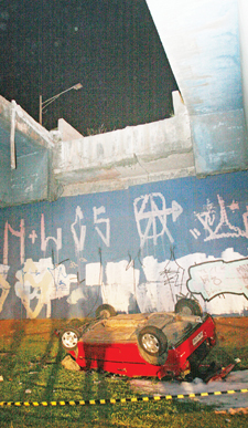 Um dos carros quebrou a mureta de proteção e despencou cerca de cinco metros. O Gol placa AGN-7250, caiu de rodas para cima e ficou completamente destruído. O casal que estava no carro, aparentando cerca de 55 anos, foi socorrido pelo Siate e encaminhado ao Hospital Evangélico.
