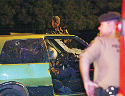 teve forças de contar alguns detalhes a policiais militares, mas não soube informar o motivo do crime. Ela relatou à tenente Canfild, do 20´ Batalhão da PM, que os assassinos atiravam contra eles havia alguns quilômetros, durante a perseguição. A mulher foi levada em estado grave ao Hospital Evangélico.