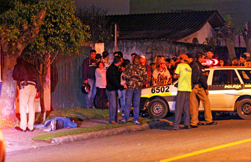 Com tiros de armas de diferentes calibres um casal foi assassinado na Rua Darci Vargas, Conjunto Itatiaia, na Cidade Industrial, às 22h de ontem. Camila da Cruz Freitas, 17 anos, morreu no banco do passageiro do Clio placa DKO-3824. O rapaz, identificado apenas como Adriano, e conhecido na vila como “Xaropinho”, foi morto na calçada, a cerca de 10 metros do carro.