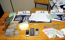 Ao meio-dia Elizeu abriu o portão e foi abordado. Em seus bolsos, foram encontradas nove pedras de crack. Na casa dele havia ainda cerca de 330 gramas de maconha, divididos em sete tabletes, 75 gramas de cocaína, três celulares e R$ 44 em notas miúdas.