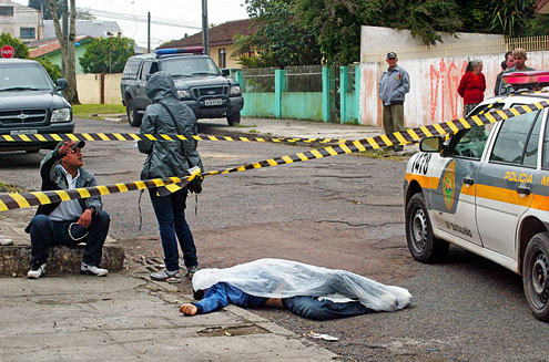 De bicicleta, um homem chegou na Rua Cidade de Figueira, no Jardim Paranaense, Alto Boqueirão, às 4h20 de ontem, efetuou vários disparos e fugiu. Dois projéteis atingiram as costas de Adriano Ferreira dos Santos, 32 anos,e outros dois, um carro estacionado na garagem de uma casa. O ferido morreu no local.