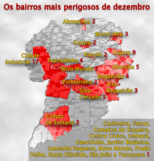 Em Curitiba foram cometidos 67 assassinatos em dezembro, menos que em agosto (69), setembro (73), outubro (86) e novembro (76). Nos últimos cinco meses de 2009, 371 pessoas perderam a vida para a violência na capital, média de quase 2,5 vítimas por dia. Assim como em todos os meses anteriores, o bairro mais violento foi a Cidade Industrial, com 17 assassinatos. O Cajuru foi o segundo na lista, com nove crimes. Chama a atenção que uma das regiões mais violentas, o Tatuquara, registrou apenas um crime fatal.