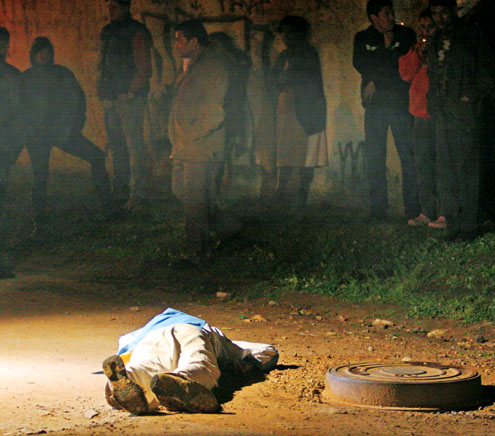 Às margens da estrada do Tietê, populares encontraram, por volta das 5h30, o corpo de um homem vestido com blusa verde, calça jeans e tênis pretos. Eles acionaram a PM, que foi até o local onde encontrou vestígios de que a vítima também foi atropelada pelos matadores. Perto do cadáver, havia ainda uma pedra grande manchada de sangue.