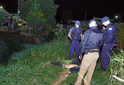 Às 23h40, Moacir Robson Nascimento, 24 anos, o “Índio”, correu dos assassinos, mas foi alcançado e atingido por várias facadas na Rua Flor de Lis, bairro São Francisco, em Araucária. Testemunhas contaram à polícia que viram os bandidos fugirem em um Corsa branco. Socorristas do Siate tiveram trabalho para retirar a vítima da valeta onde caiu. Moacir ficou com a faca cravada no pescoço.