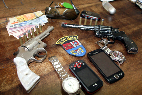 Um deles portava um revólver calibre 38, e o outro carregava um revólver de mesmo calibre em uma bolsa. Willian já esteve preso, de acordo com a Polícia Civil, por receptação, porte ilegal de arma de fogo e roubo. Na residência de Jimmy, os policiais militares apreenderam um rádio comunicador que estava conectado à freqüência da polícia, além de jóias e outros objetos que podem ter sido roubados de outras famílias. O material foi entregue na Delegacia de Furtos e Roubos de Veículos.