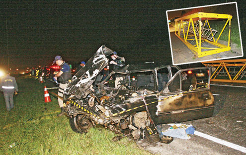 O condutor perdeu o controle da direção, bateu de frente com a estrutura. O motor e outras partes do carro foram ficando pela rodovia. O motorista do caminhão não parou para prestar socorro e deixou as vítimas e a peça para trás.