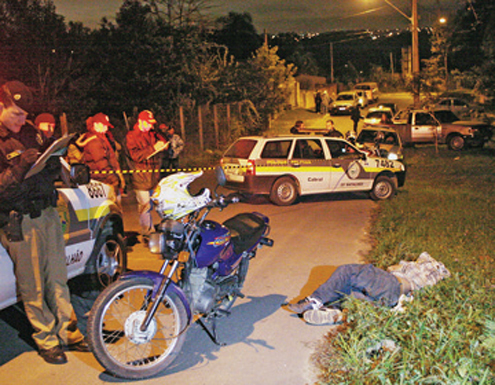 Com dois tiros na cabeça, o auxiliar de serviços gerais Gredison Lauro Prodossimo, 24 anos, foi morto, por volta das 21h30 de domingo, na Rua Wilson Gomes Ramos, no Abranches, próximo do acesso à Rodovia dos Minérios. A moto da vítima estava estacionada próximo de onde ocorreu o homicídio.