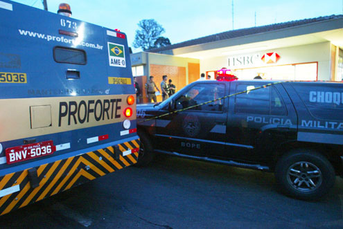 Uma quadrilha de assaltares crivou de balas um carro-forte e feriu dois clientes da agência do HSBC e um segurança do veículo, na Rodovia João Leopoldo Jacomel, em Pinhais, no fim da tarde de ontem. As vítimas foram feridas no tiroteio travado com os seguranças do carro-forte, nenhuma com gravidade. Os bandidos usavam armas de grosso calibre.