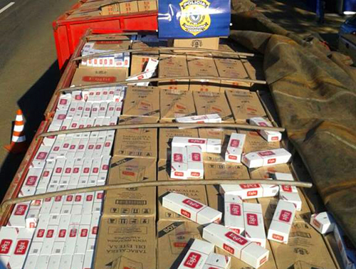 Ao retirar as lonas dos semirreboques, os policiais rodoviários federais constataram que a combinação de veículos estava carregada com cerca de 900 caixas de cigarros, o equivalente a 450 mil maços.