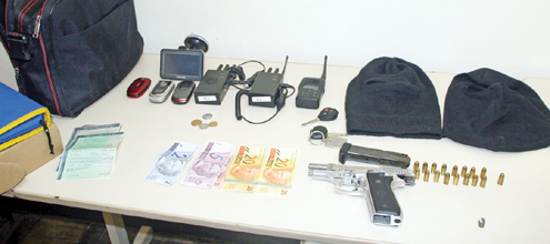 Ele estava com o Honda Fit placa MVB-9096 e no interior do veículo foram apreendidas uma pistola calibre 38, carregada e com alerta de furto, duas toucas balaclava, dois bloqueadores de rastreamento de veículos, um radiocomunicador na freqüência da polícia e três celulares.