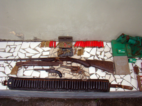 No interior da casa os policiais encontraram quatro armas de fogo, sendo uma espingarda calibre 36, uma garrucha calibre 38, ambas de fabricação artesanal, além de um garruchão calibre 38, e um revélver da marca Rossi, calibre 38. Também foram apreendidos 50 cartuchos de calibre 32, 11 cartuchos de calibre 36, 81 cartuchos de calibre 38, além de aviamentos para recarga de munições.