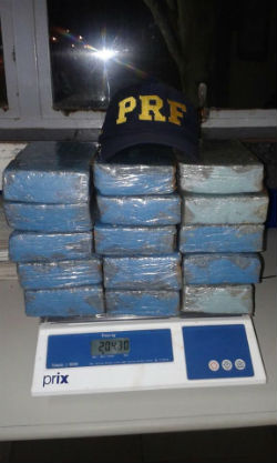A Polícia Rodoviária Federal (PRF) prendeu na madrugada desta segunda-feira (18) dois homens que transportavam 20,3 quilos de maconha. A droga, dividida em 15 tabletes, estava em uma mala, dentro de um automóvel Volkswagen Gol.