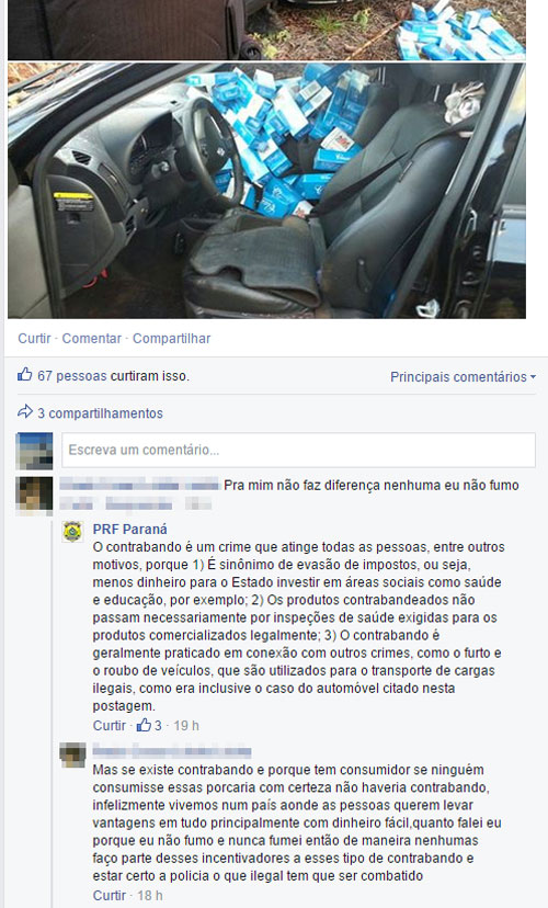 A Polícia Federal Rodoviária (PRF) estava “quieta” postando uma apreensão de cigarros contrabandeados no Paraná quando um seguidor fez um comentário infeliz. “Pra mim não faz diferença nenhuma eu não fumo”, disse o rapaz.
