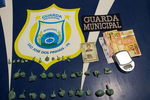 Guardas Municipais de São José dos Pinhais, Região Metropolitana de Curitiba (RMC), prenderam no início da madrugada desta segunda-feira (4) um rapaz identificado como Bruno Henrique dos Santos Cavalheiro, conhecido como “Bruninho”, de 20 anos. Ele estava em uma moto em frente a uma lanchonete na Rua Raul de Oliveira Machado, no bairro Zaniolo, e portava uma pequena quantidade de maconha.