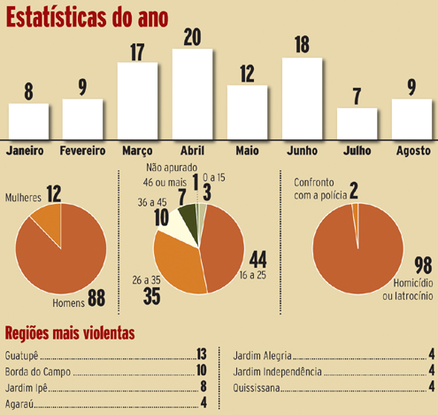Perfil. O levantamento exclusivo do Paraná Online revela que foram 88 homens e 12 mulheres assassinadas. Quase 50% das vítimas tinham menos de 26 anos. Apenas duas pessoas foram mortas em confrontos com a polícia, o restante foi vítima de homicídio, latrocínio ou lesão corporal seguida de morte. Entre as regiões mais violentas estão Guatupê, Borda do Campo e Jardim Ipê. Abril foi o mês com mais assassinatos no município, e julho, o menos violento.