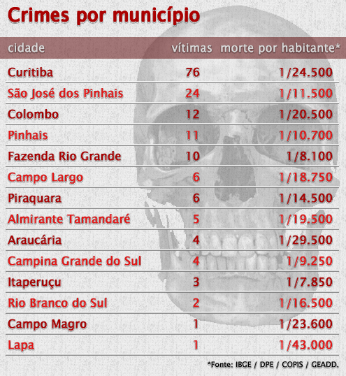 São José dos Pinhais disparou na liderança das mortes entre os municípios da região metropolitana. Em novembro, foram 24 assassinatos, aumento de 41% com relação ao mês anterior. Também cresceu a violência em Pinhais e Fazenda Rio Grande. Pelo segundo mês seguido, Colombo diminuiu o índice de mortes. No total das cidades vizinhas, houve 91 crimes fatais, em 15 dos 24 municípios.
