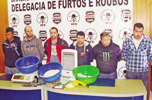 Um sexteto foi preso numa fábrica de refino de cocaína no Umbará, na tarde de terça-feira. O grupo foi surpreendido por policiais da Delegacia de Furtos e Roubos (DFR), enquanto produzia droga numa casa, que funcionava como laboratório. Na residência, foram apreendidos 900 gramas de pasta-base suficiente para produzir 6 quilos da droga, com valor estimado de R$ 200 mil.