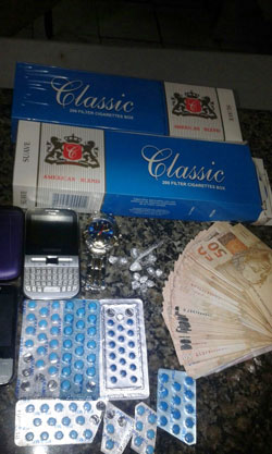 O grupo apreendeu com Marquinhos 90 comprimidos de pramil, 10 pedras de crack, uma pedra de cocaína, dois maços de cigarro e uma quantia em dinheiro de aproximadamente 4 mil reais.