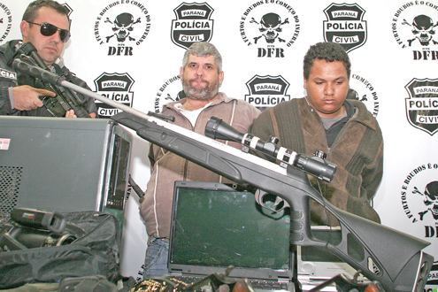 Uma dupla foi presa por policiais militares no Tatuquara, na noite de segunda-feira (30), suspeita de pelo menos cinco assaltos a casas e chácaras, em Curitiba. Luis Antônio Taborda dos Santos, 21 anos, e Luis Cláudio de Godoy, 44, portavam dois revólveres calibre 38 com numeração raspada e, na casa deles, a polícia apreendeu televisores, computadores, joias, uma espingarda com mira telescópica e radiocomunicadores. “Com exceção dos rádios e das armas, tudo era roubado. Eles agiam com violência, e esperamos que as vítimas se dirijam até a delegacia para reconhecê-los e para reaver seus bens”, disse o delegado Rodrigo Brown de Oliveira, da Delegacia de Furtos e Roubos (DFR).