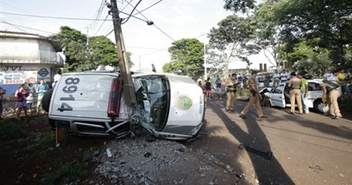 Quatro pessoas estão feridas, entre elas dois policiais. Segundo o soldado Afrânio Santi, do Corpo de Bombeiros, uma mulher fez uma conversão para virar em uma esquina e bateu no carro da PM, que trafegava pela mesma via, em sentido contrário.
