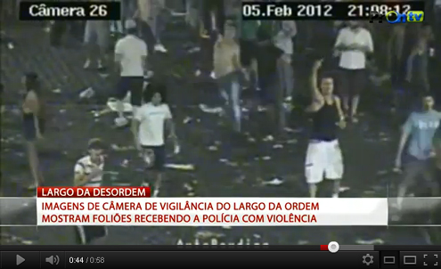 Um vídeo divulgado ontem no YouTube mostra baderneiros atirando objetos contra foliões, policiais e viaturas. Até as barracas da feira de artesanato e de um vendedor de bebidas foram usadas. As imagens teriam sido feitas de uma câmera de segurança, pouco depois das 21h.