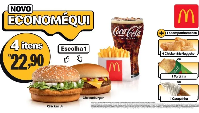 Por apenas R$ 22,90, dá para montar um combo com quatro itens bem legais: você escolhe entre Chicken Jr. ou Cheeseburger, leva uma McFritas pequena, um refri e ainda pode escolher um acompanhamento super saboroso – Chicken McNuggets com 4 unidades, uma casquinha ou uma tortinha (de banana ou maçã).