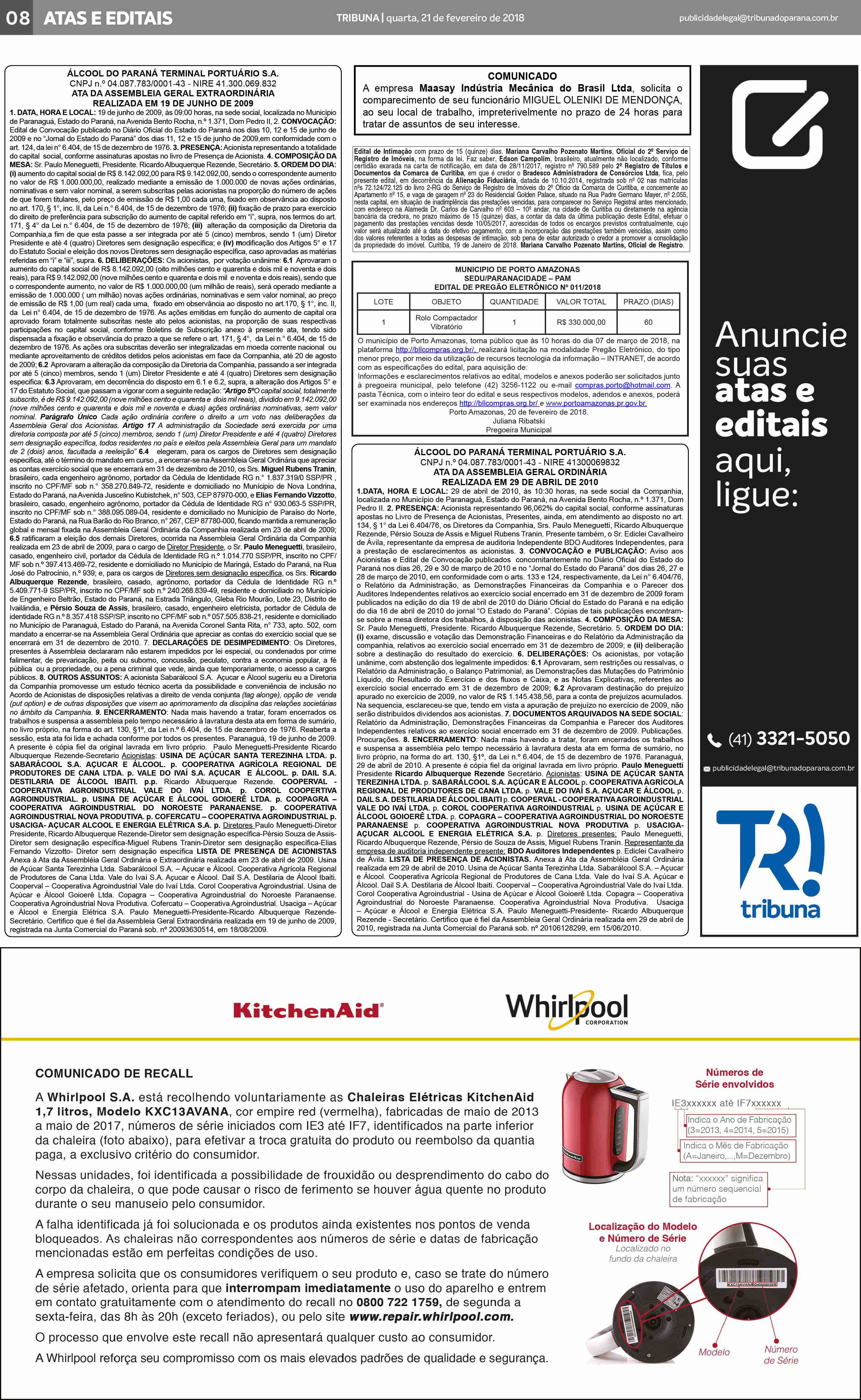 HomePublicidade LegalMatéria Publicidade Legal – 21/02/2018 Publicidade Legal veiculada no jornal Tribuna do Paraná, em 21 de fevereiro de 2018, na página 08. Fazer download Anunciantes nesta página: Álcool do Paraná Terminal Portuário S.A.,Maasay Indústria Mecânica do Brasil,Município de Porto Amazonas,Whirlpool - Recall
