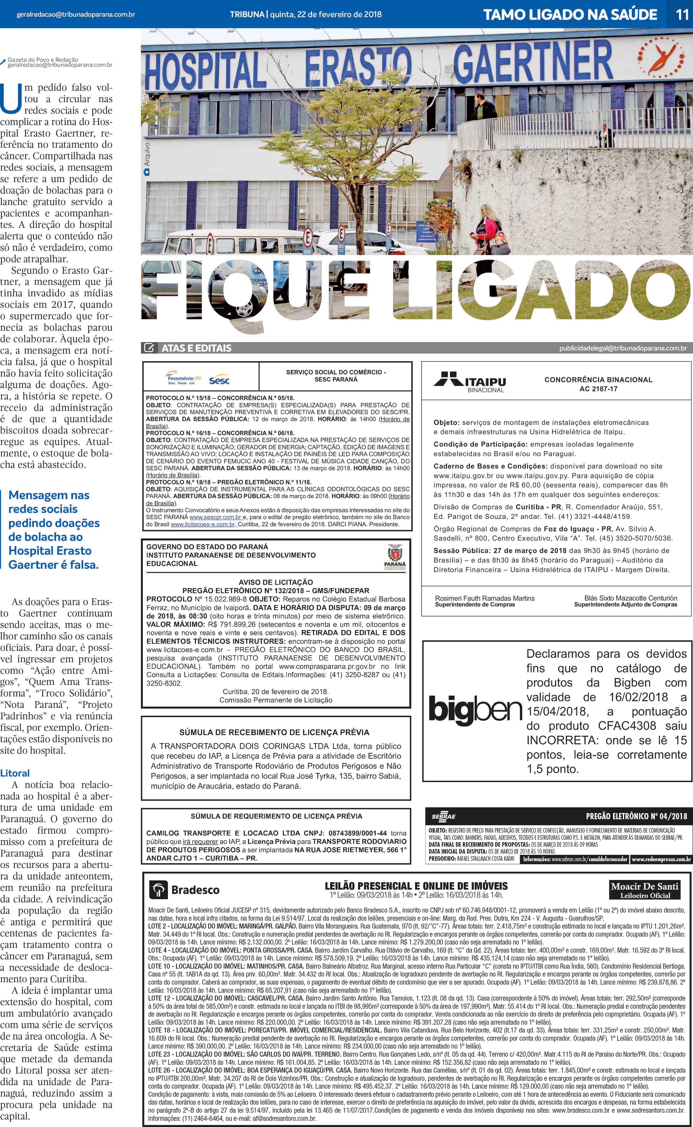 HomePublicidade LegalPublicidade Legal -22/02/218 Publicidade Legal -22/02/218 Publicidade Legal veiculada no jornal Tribuna do Paraná, em 22 de fevereiro de 2018, na página 11. Fazer download Anunciantes nesta página: BigBen,Bradesco- Leilão Moacir de Santi,Camilog Transporte e Locação Ltda,Fecomércio | Sesc-PR,Governo Estado do Paraná,Itaipu Binacional,Transportadora de Dois Coringas