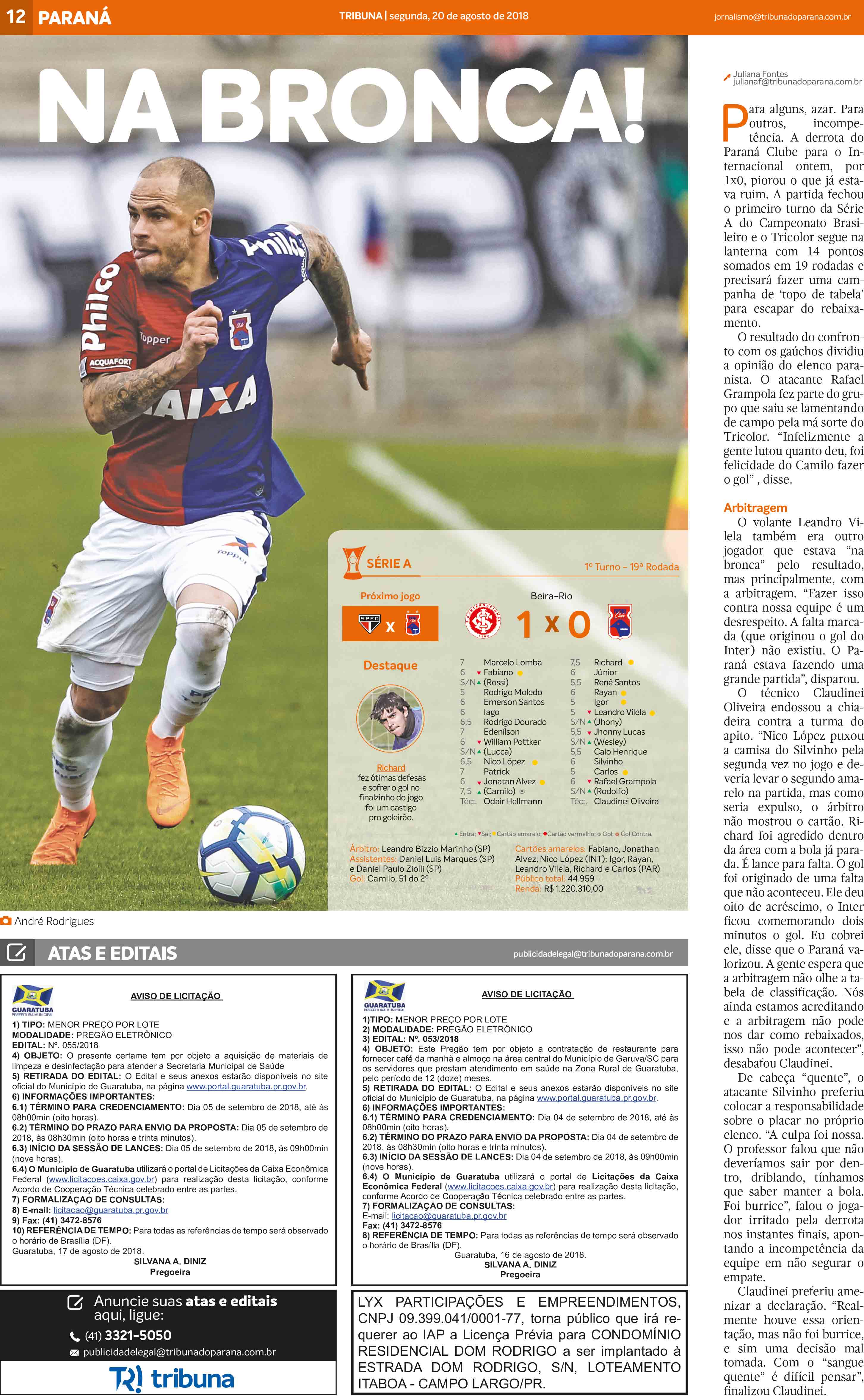 HomePublicidade LegalPublicidade Legal 20/08/2018 Publicidade Legal 20/08/2018 Publicidade Legal veiculada no jornal Tribuna do Paraná, em 20 de agosto de 2018, na página 12. Fazer download Anunciantes nesta página: LYX Participações e Empreendimentos,Prefeitura Municipal de Guaratuba