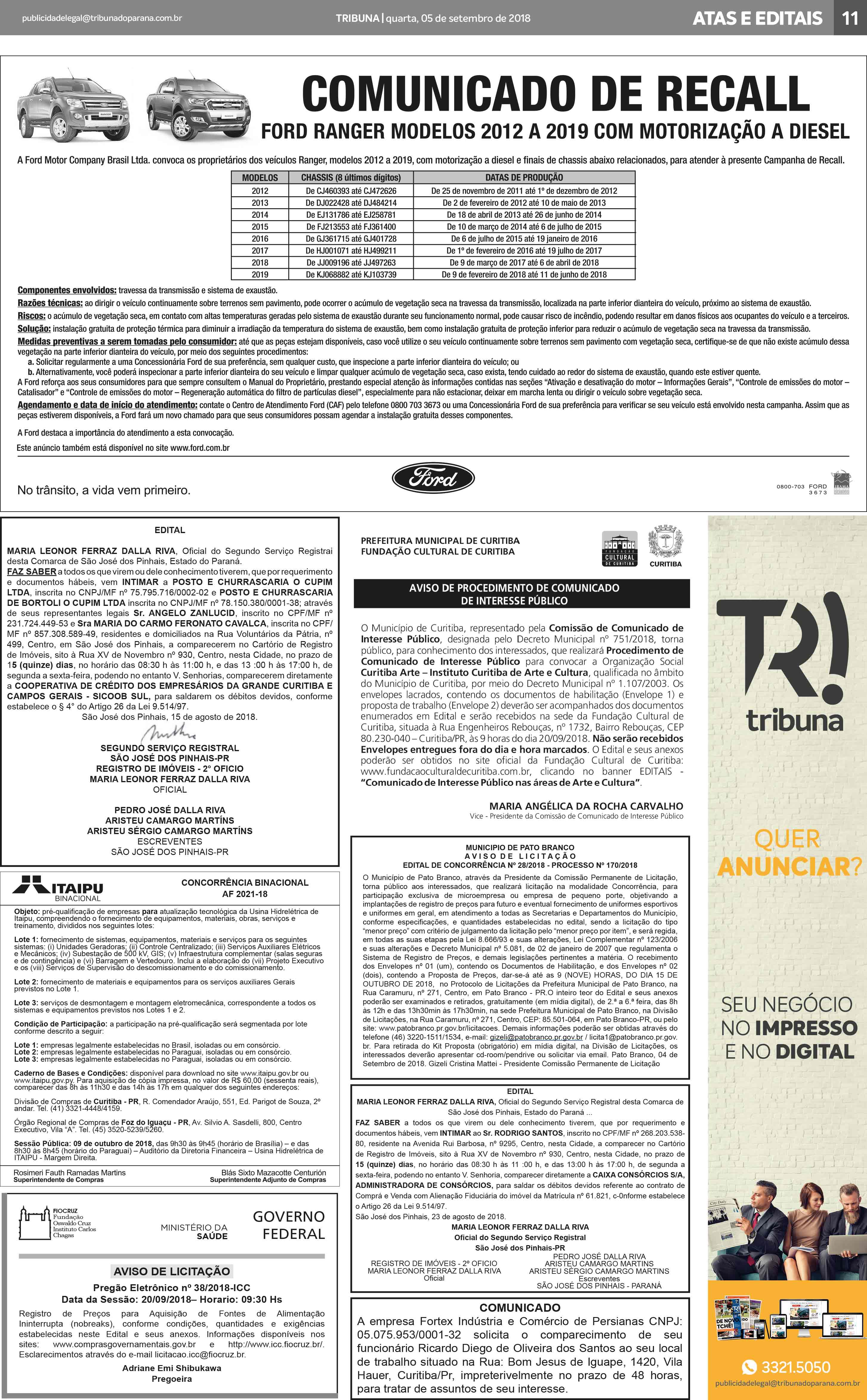 Publicidade Legal veiculada no jornal Tribuna do Paraná, em 5 de setembro de 2018, na página 11.