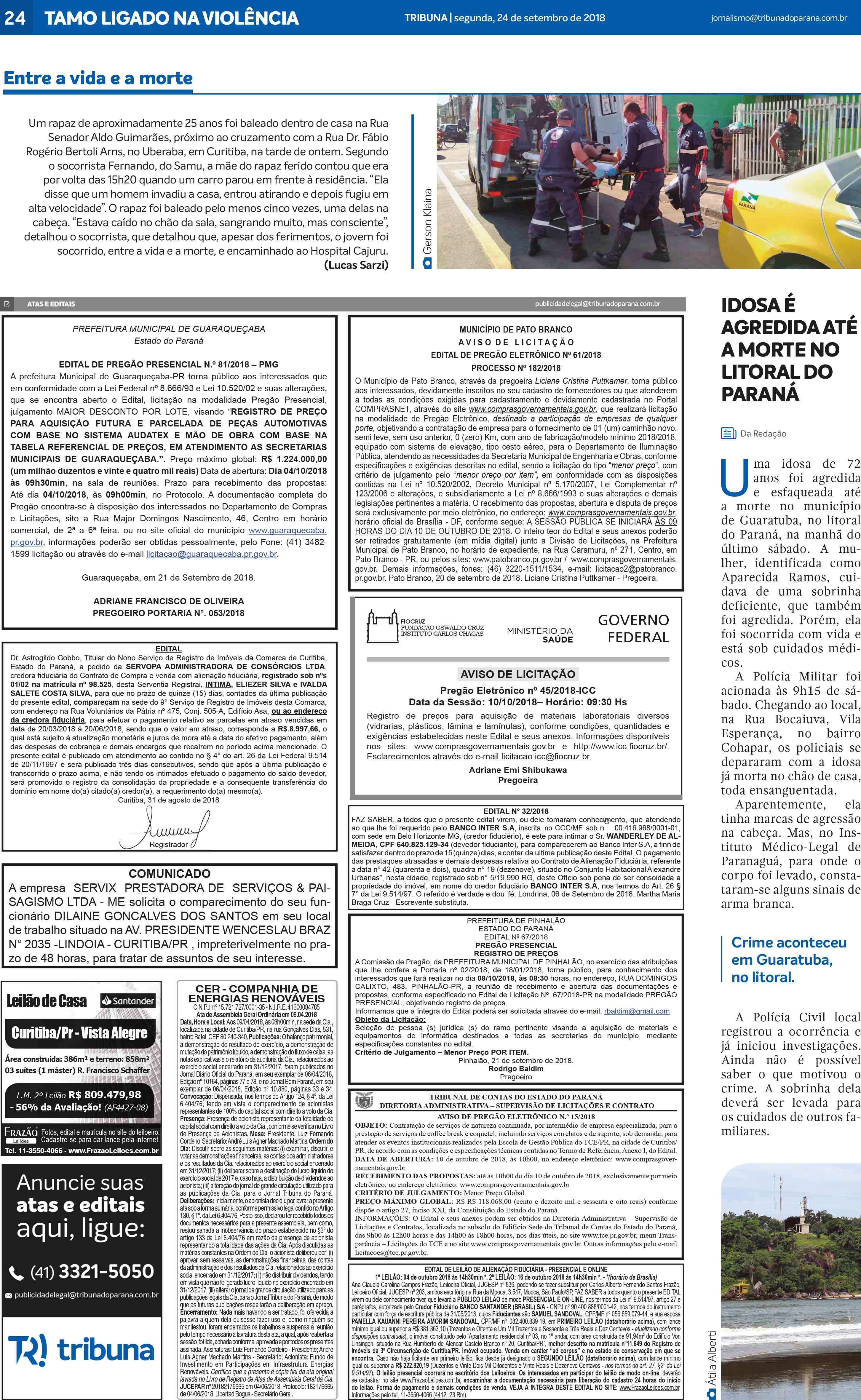 Publicidade Legal veiculada no jornal Tribuna do Paraná, em 24 de setembro de 2018, na página 24.