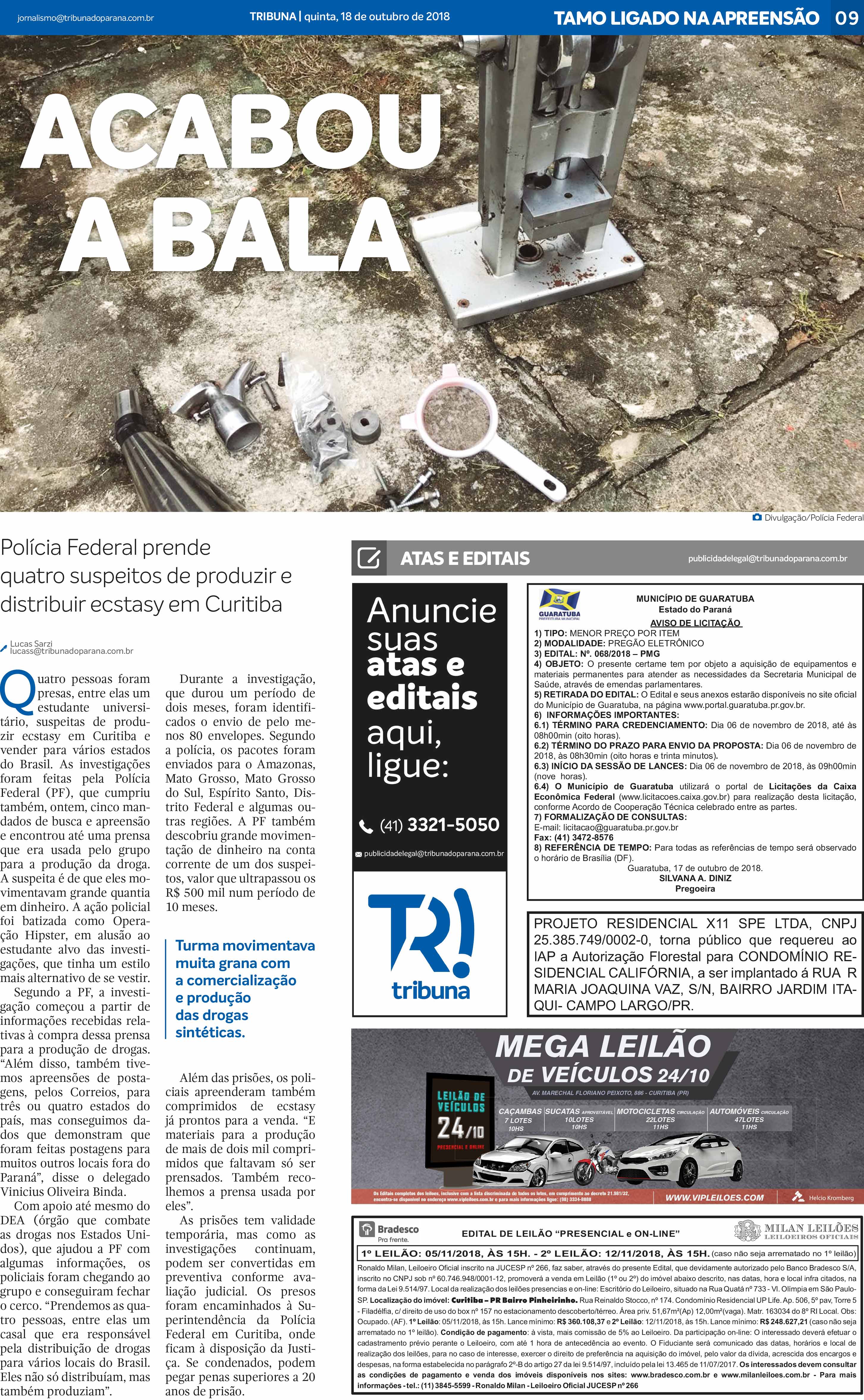 Publicidade Legal veiculada no jornal Tribuna do Paraná, em 19 de outubro de 2018, na página 09.