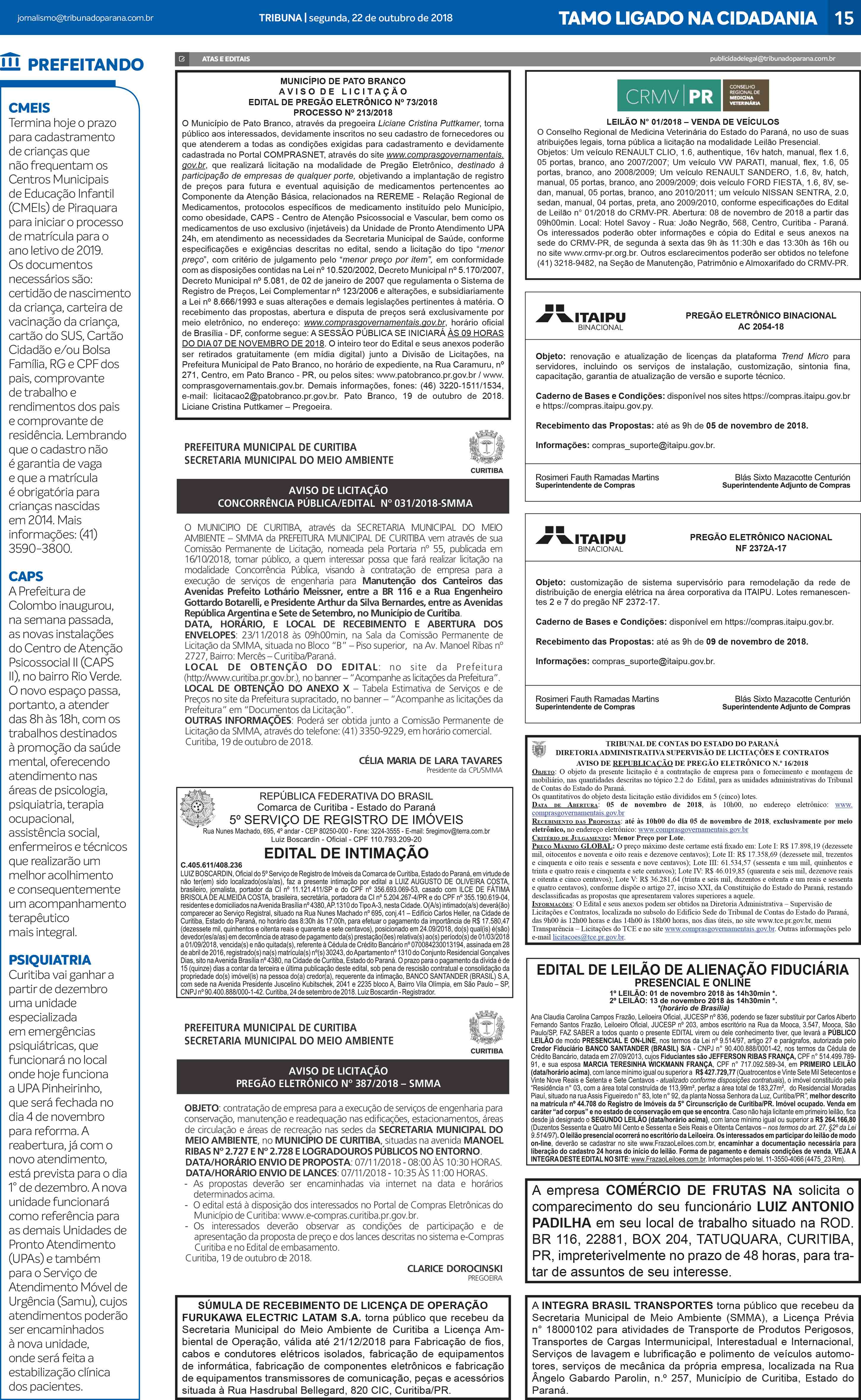 Publicidade Legal veiculada no jornal Tribuna do Paraná, em 24 de outubro de 2018, na página 15.