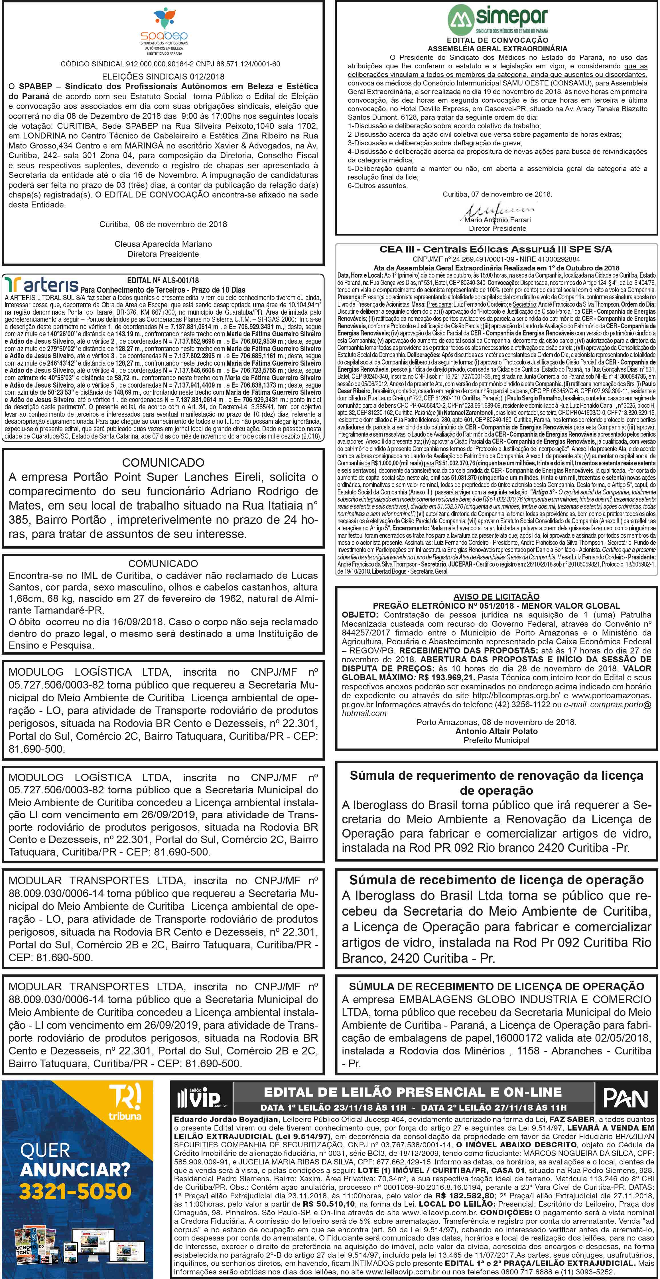 Publicidade Legal veiculada no jornal Tribuna do Paraná, em 27 de novembro de 2018, na página 09.